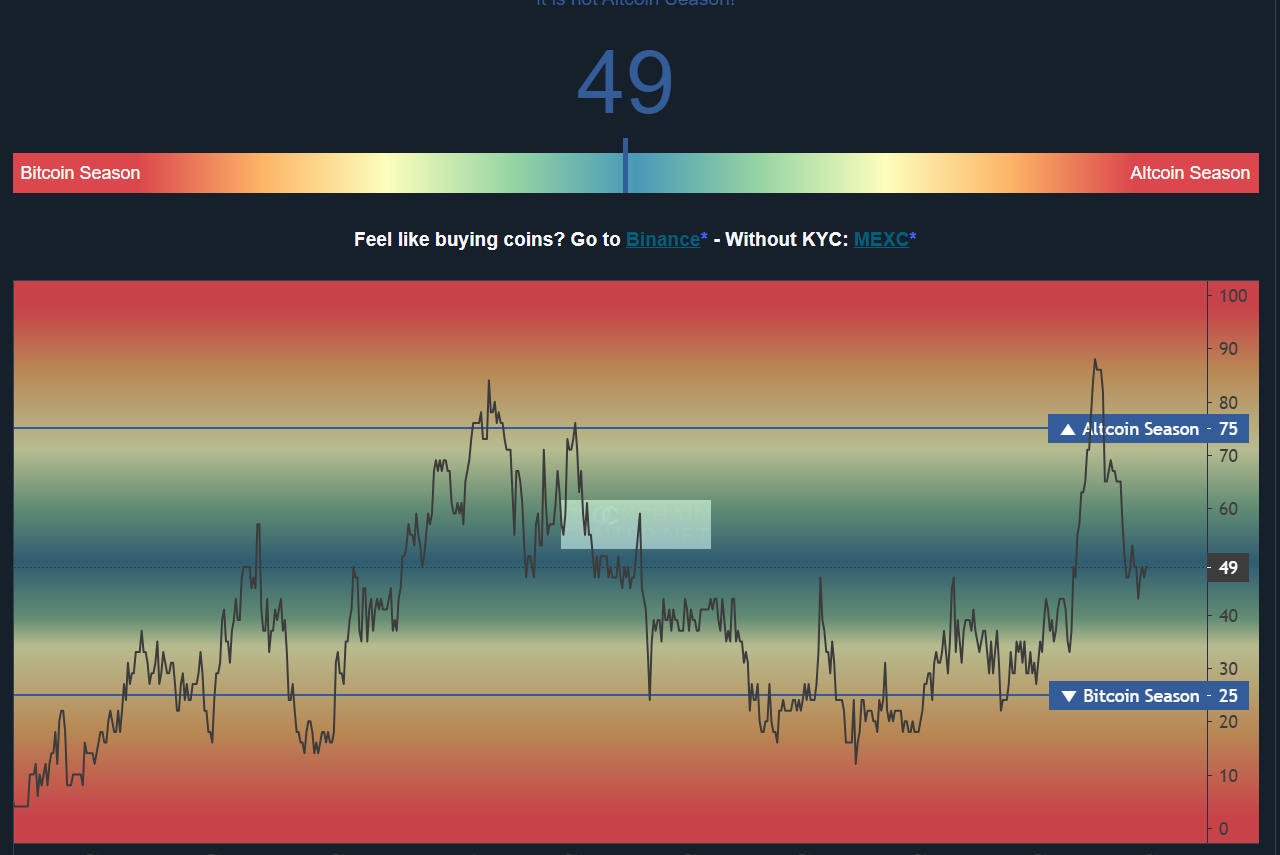 - 현재 알트코인 시즌 지수: 49 (비트코인 시즌)