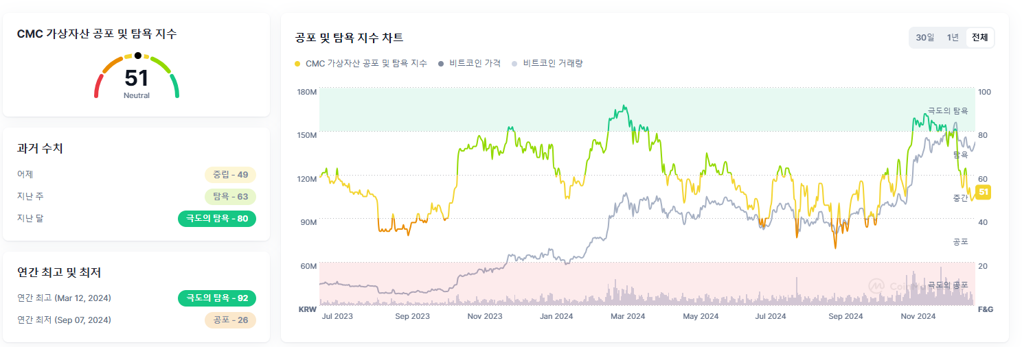 - 전체 심리 상태 지수: 현재 중립인지 상태입니다(지수 51). 이는 투자자들이 비트코인에 대해 안정적인 심리를 유지하고 있다는 것을 의미합니다.