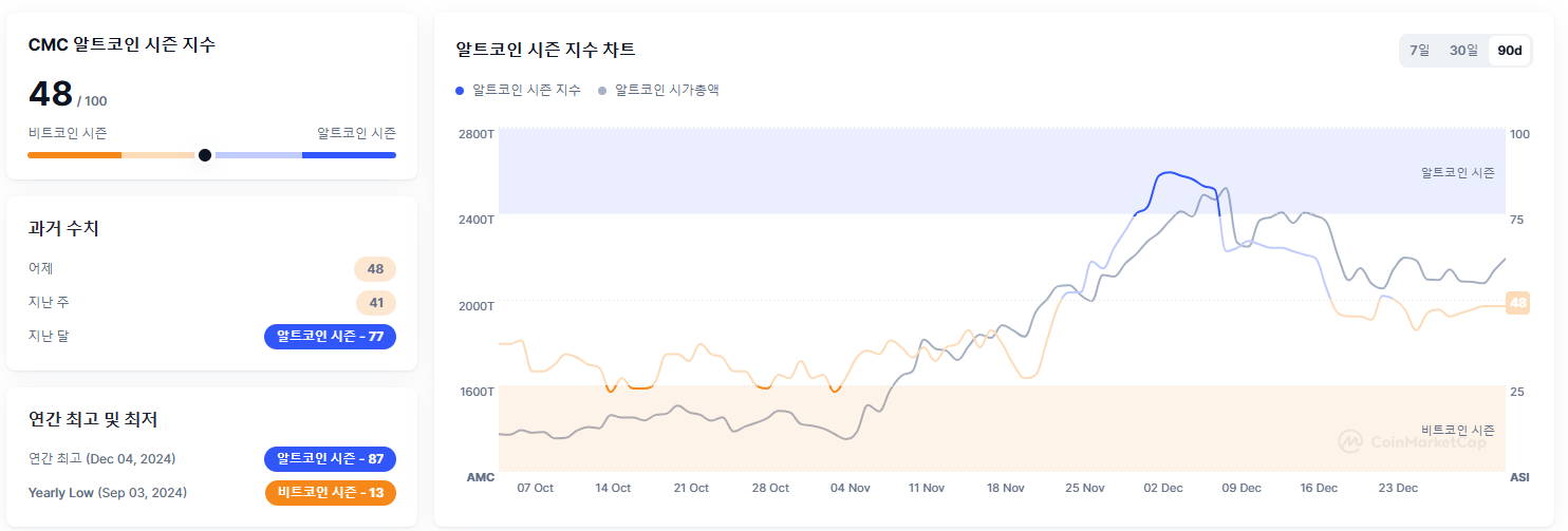 - 알트코인 시즌 지수: 현재 지수는 48로, 비트코인 시즌에 가까운 상태입니다. 이는 알트코인에 대한 관심이 크게 없다는 것을 나타냅니다.
