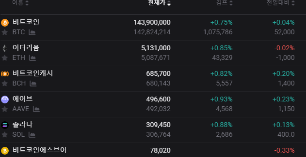 - 현재 비트코인의 가격은 약 143,900,000원으로, 작은 변동(+0.75%)을 보이고 있습니다.
