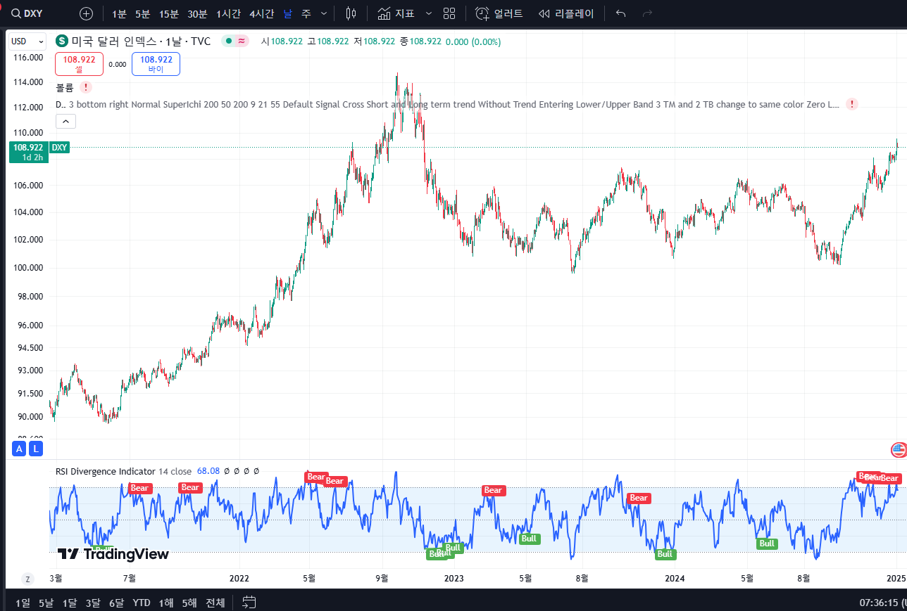 - 달러 인덱스 (DXY): 108.922 (변동 없음)