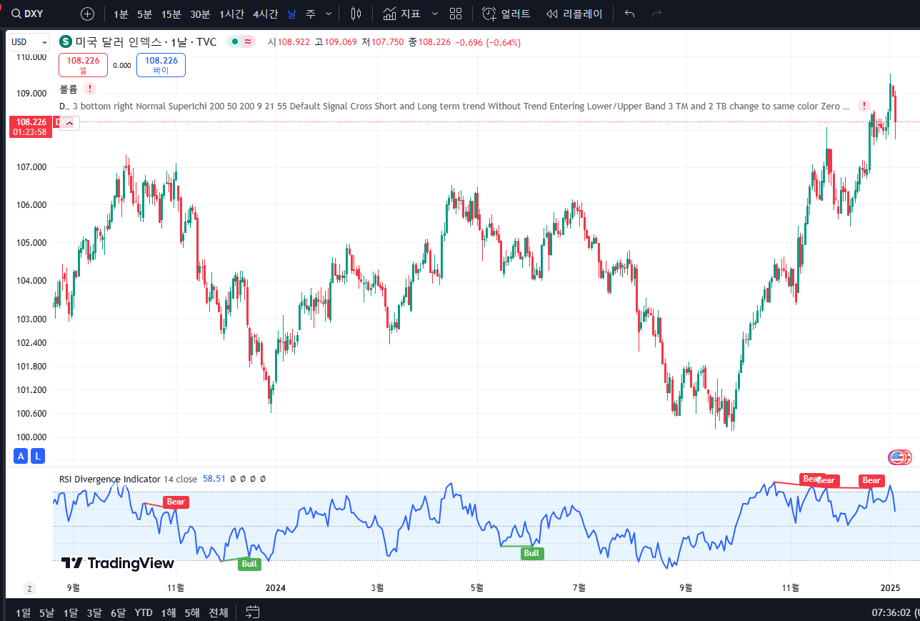 - 달러 인덱스 (DXY): 108.230 (전일 대비 -0.692, -0.64%)