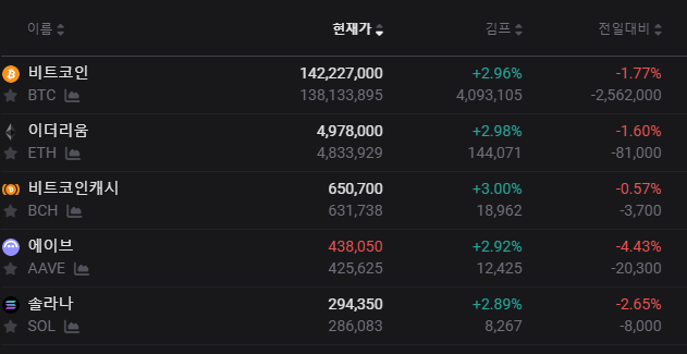 - 비트코인 현재가: ₩142,227,000 (+2.96%)