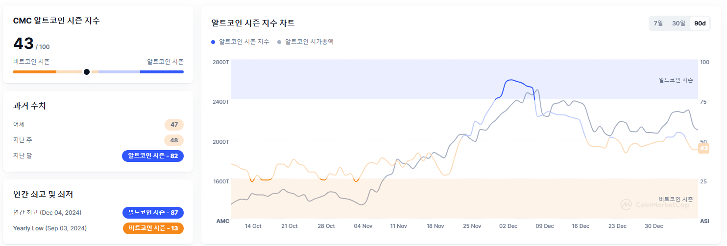 - 현재 알트코인 시즌 지수는 43으로, 비트코인에 비해 낮은 수준입니다. 이는 알트코인에 대한 투자자들의 관심이 줄어들고 있음을 나타냅니다.