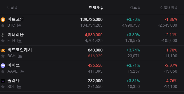 - 비트코인 현재가: ₩139,725,000 (+3.70%)