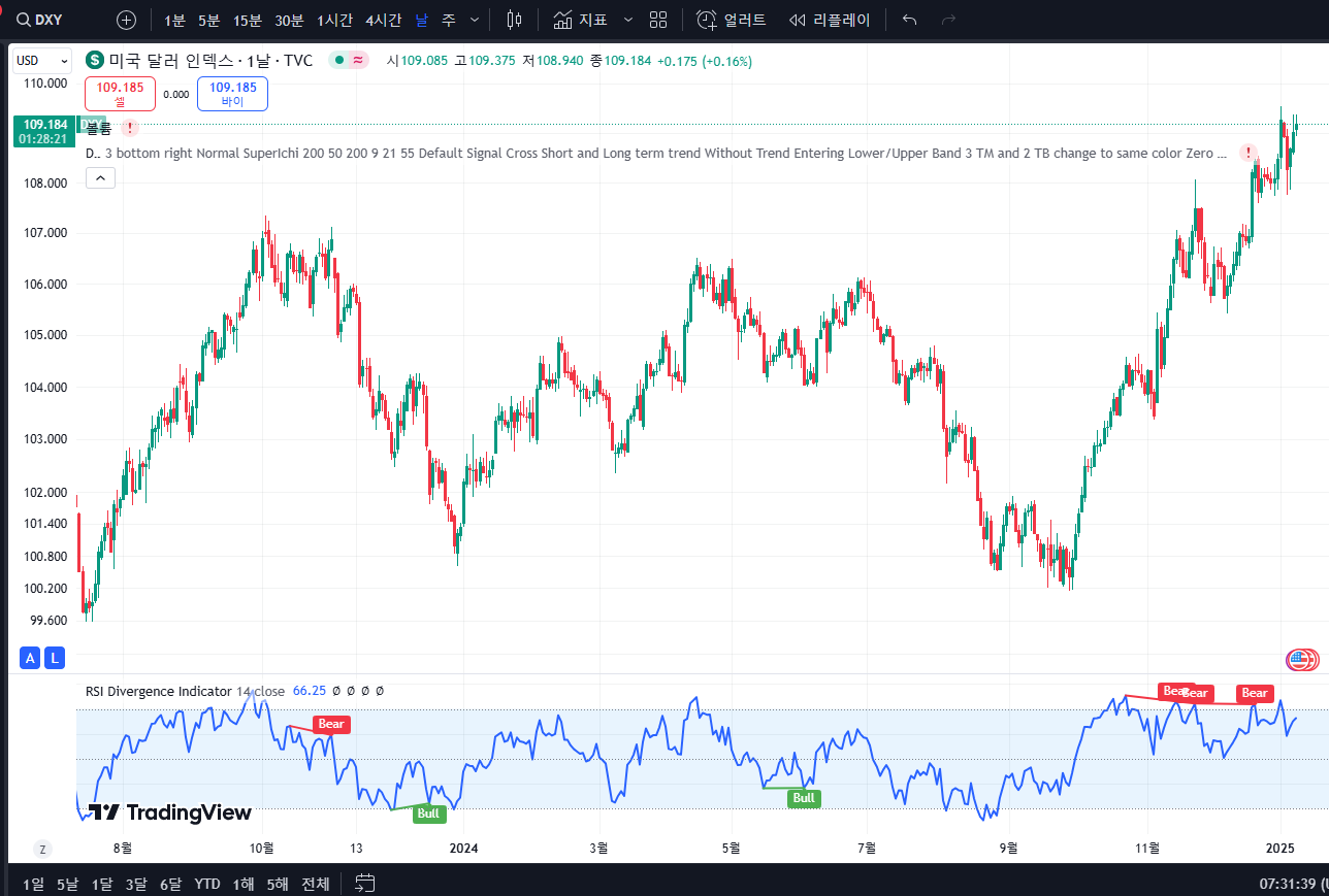 - RSI가 66.25로, 과매수 영역에 가까운 상태입니다. 이는 달러 인덱스의 상승세가 지속될 가능성을 시사합니다.