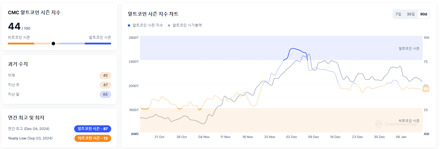 - 현재 알트코인 시즌 지수는 44로, 비트코인에 비해 상대적으로 낮은 수준입니다. 이는 알트코인에 대한 투자자들의 관심이 줄어들고 있음을 나타냅니다.