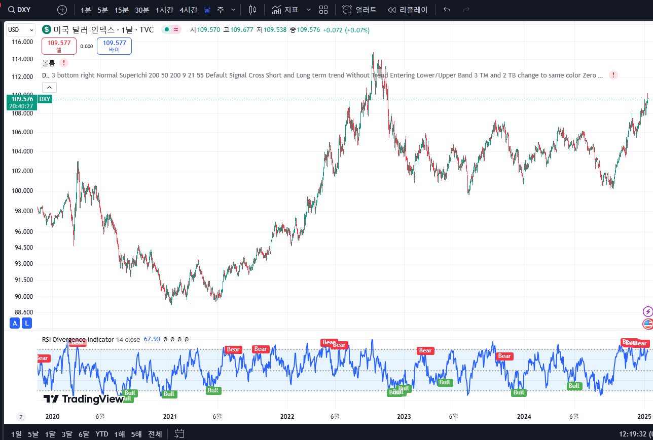 - RSI가 67.93으로, 과매수 영역에 가까운 상태입니다. 이는 달러 인덱스의 상승세가 지속될 가능성을 시사합니다.