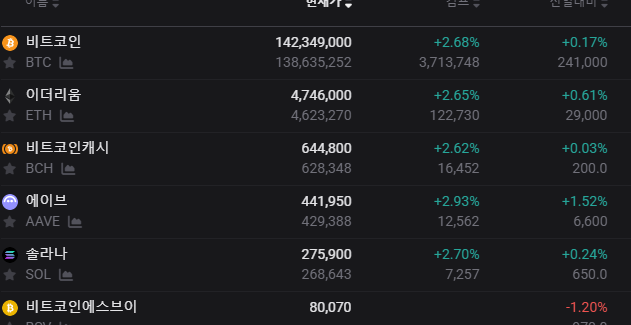 - 비트코인 현재가: ₩142,349,000 (+2.68%)