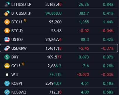 - 환율: USD/KRW 1,461.18 (-5.45, -0.37%)