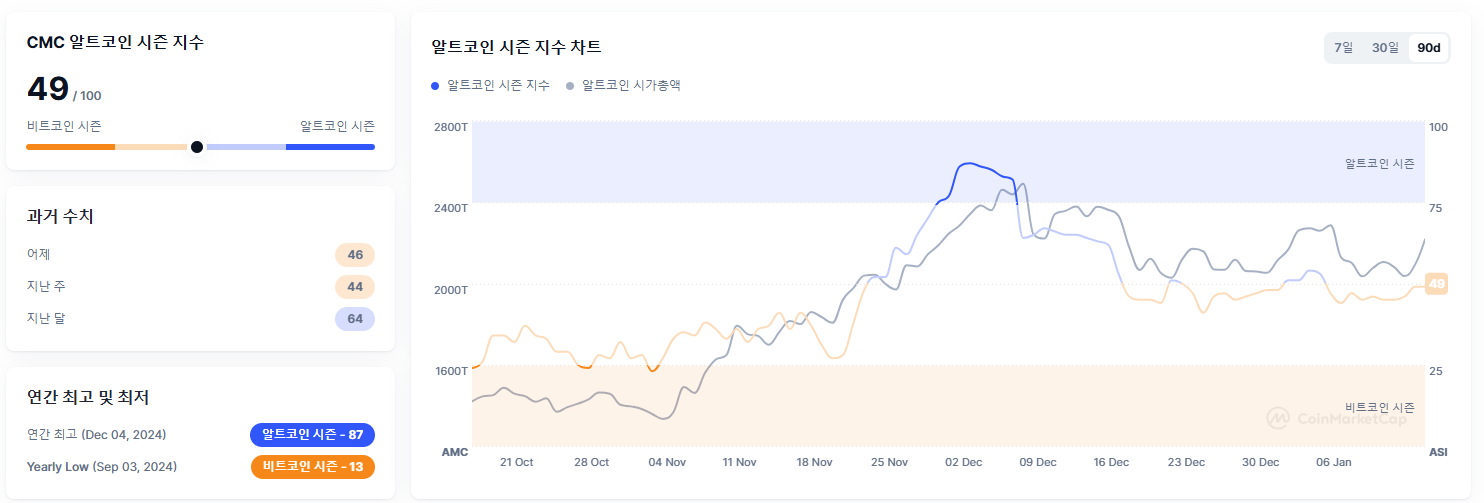 - 알트코인 시즌 지수가 49로, 알트코인에 대한 투자 심리가 상승세를 보이고 있지만 아직 비트코인에 비해 약한 상태입니다.