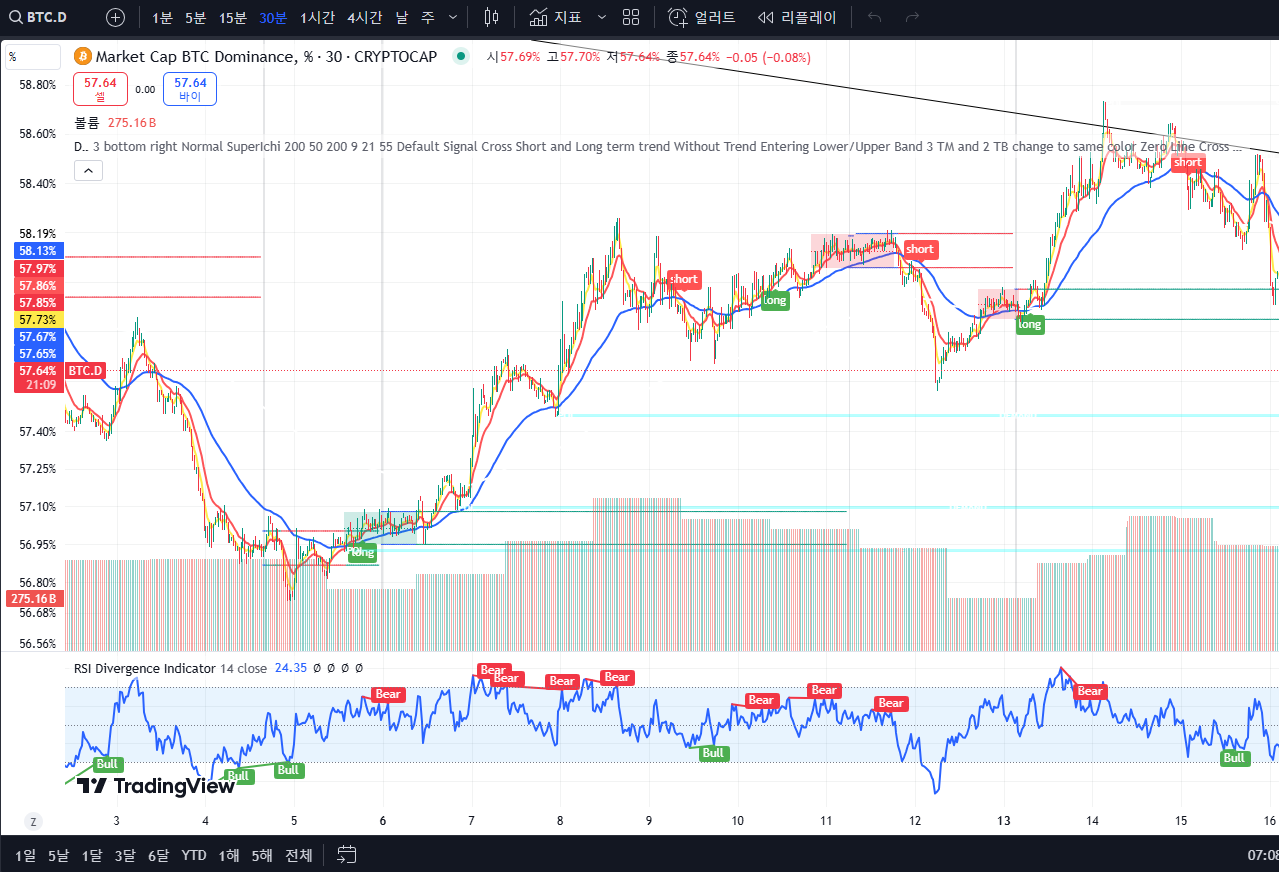 - 비트코인 도미넌스: 57.64% (0.08% 하락)