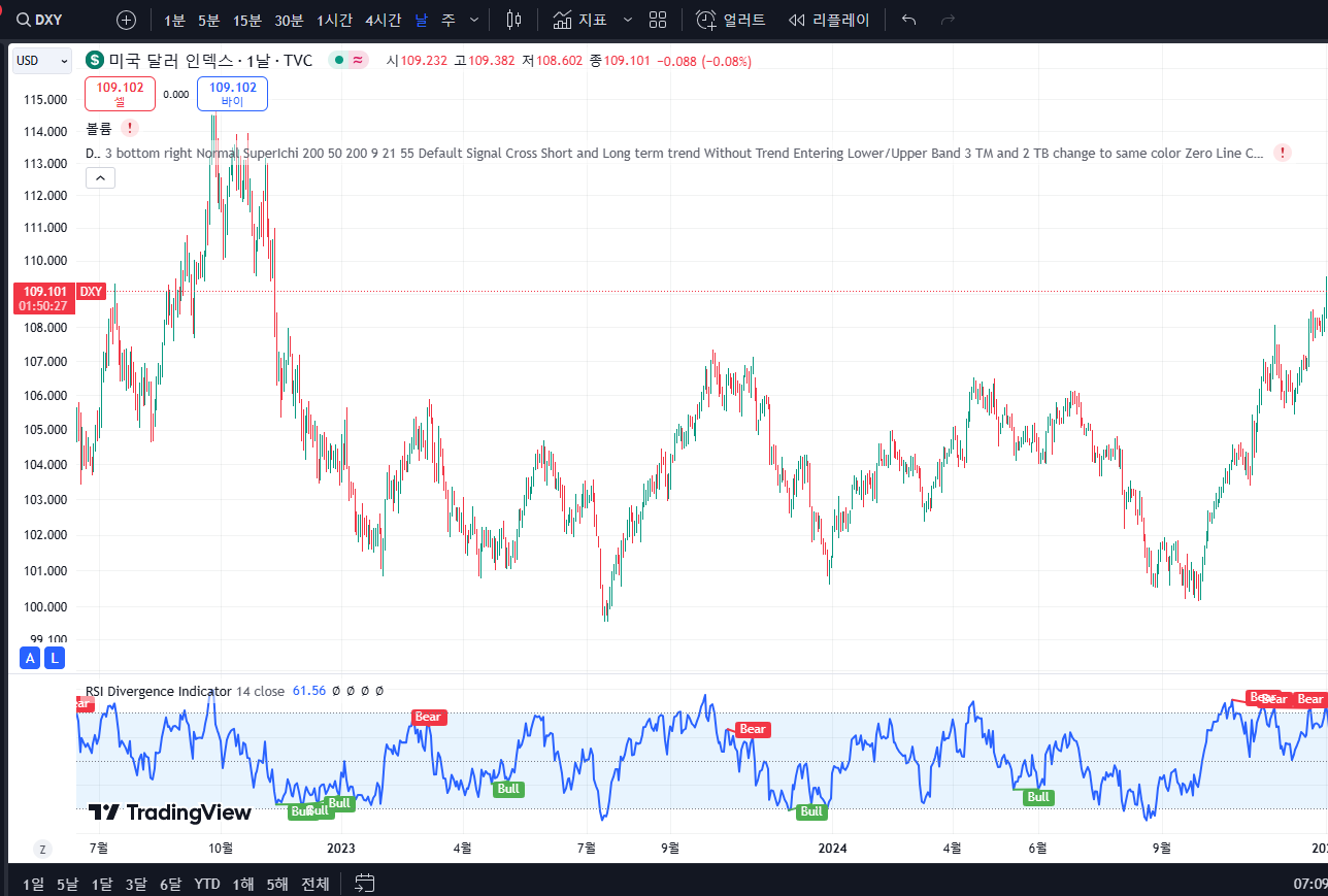 - 달러 인덱스 하락: DXY가 하락하고 있다는 것은 달러 가치가 약세를 보이고 있음을 의미하며, 비트코인 같은 자산의 매력을 높일 수 있습니다.