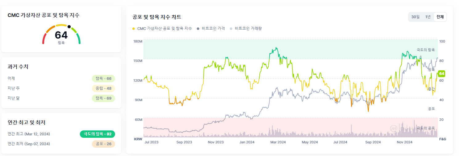 - CMC 가상자산 공포 및 탐욕 지수: 64 (탐욕)