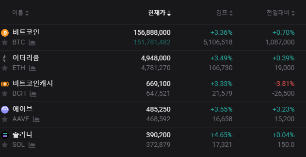 - 비트코인 현재가: 156,888,000 원 (+3.36%)