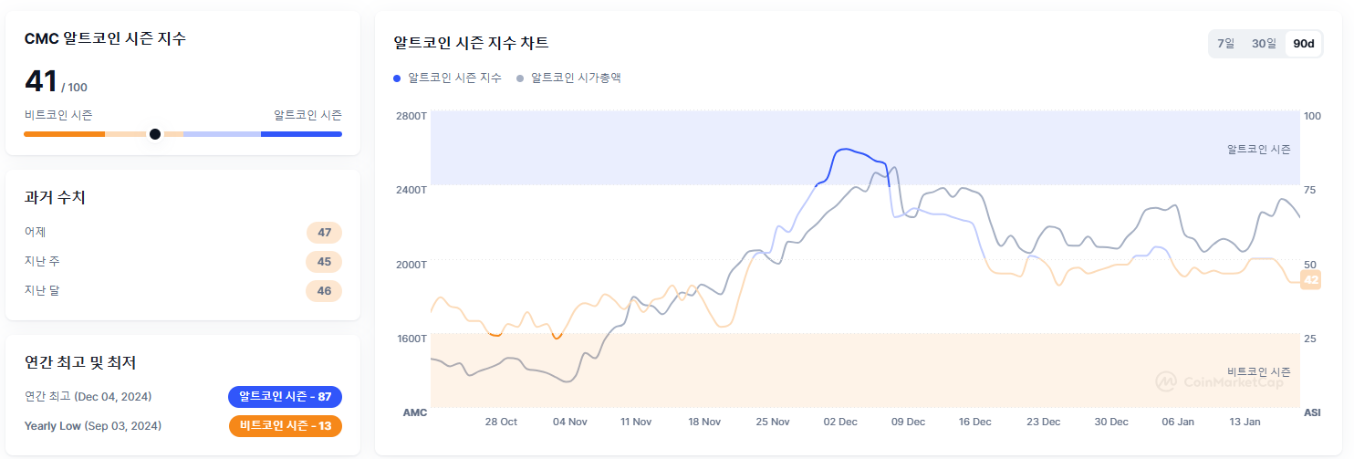 - 알트코인 시즌 지수: 41/100