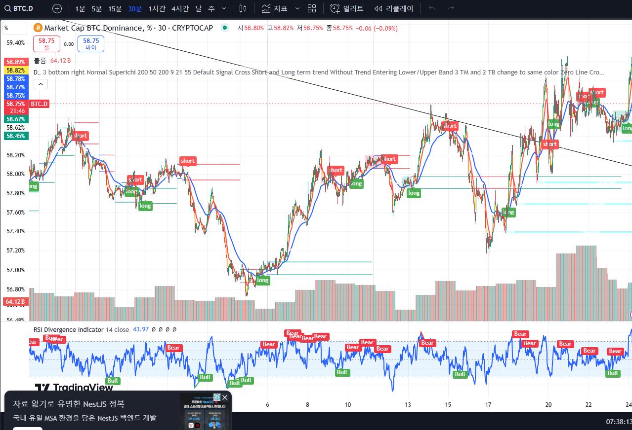 - 비트코인 도미넌스 (BTC.D): 58.75%