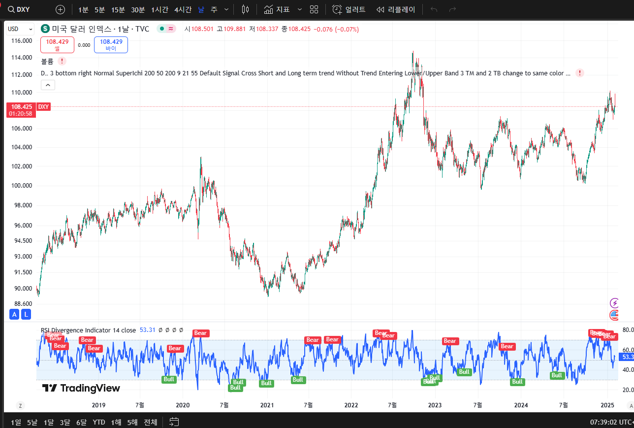 - 달러 인덱스 (DXY): 108.421 (전일 대비 -0.080, -0.07%)