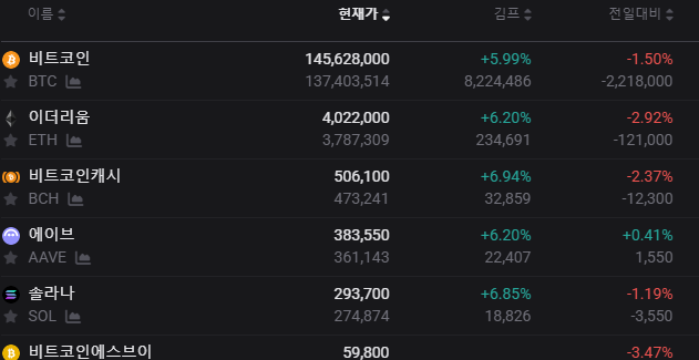 - 비트코인 현재가: ₩145,628,000 (+5.99%)