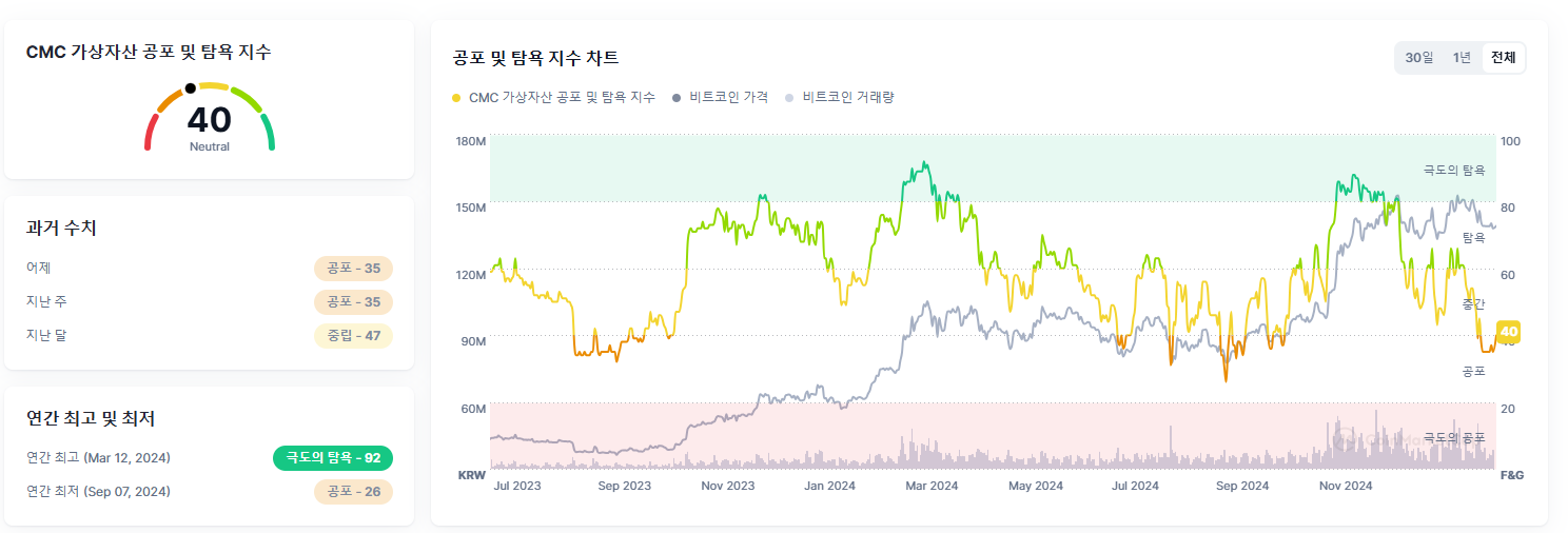 - 가상자산 공포 및 탐욕 지수: 40 (중립)