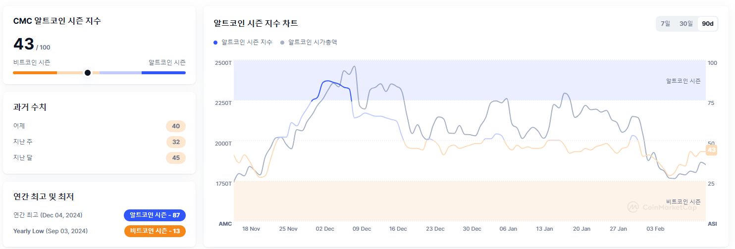 - 알트코인 시즌 지수: 43/100