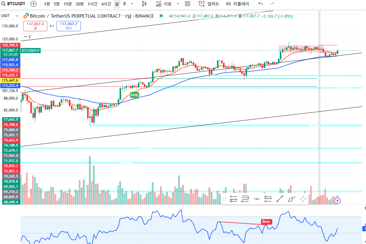 - $115,500 지지선 보호 시: 추가 매수 기회