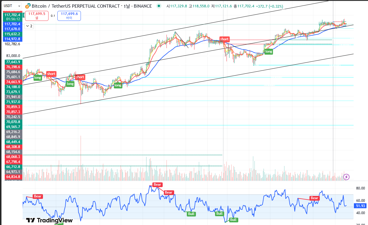 현재 비트코인은 117,000달러 ~ 118,000달러 구간에서 강한 저항과 지지를 받고 있으며, RSI 지표상 과매수 구간 근처에 위치해 있습니다.